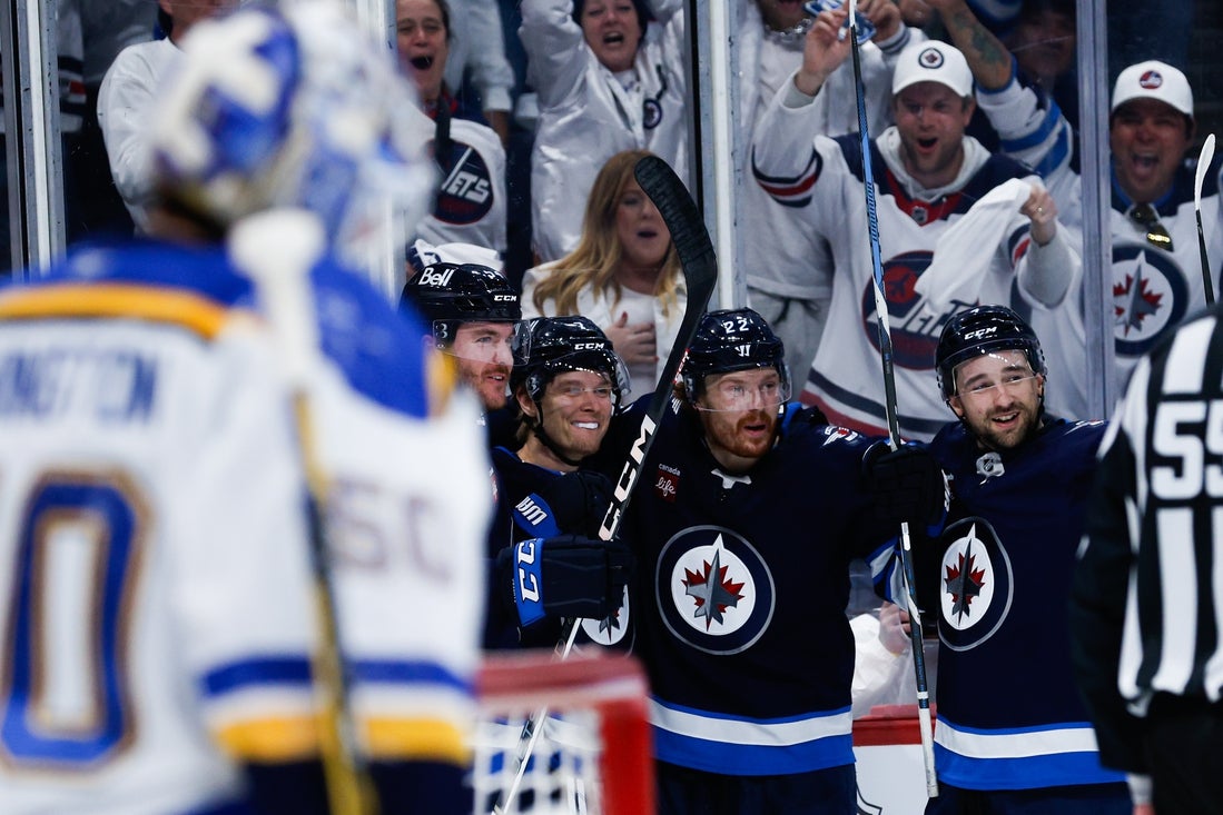 A point shot by Jets defenseman Dylan DeMelo deflected off St. Louis defenseman Colton Parayko and into his own net to move the Jets back in front 3-2 at 11:05.