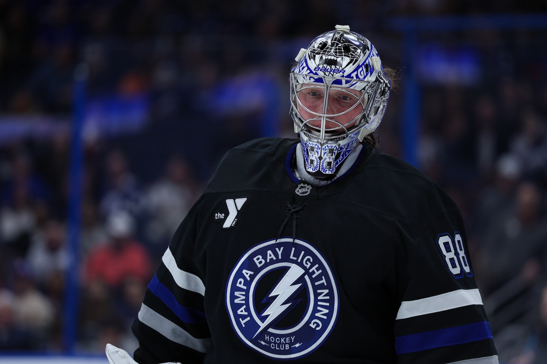 Feb 1, 2025; Tampa, Florida, USA; Tampa Bay Lightning goaltender Andrei Vasilevskiy (88) looks on against the New York Islanders in the first period at Amalie Arena. Mandatory Credit: Nathan Ray Seebeck-Imagn Images