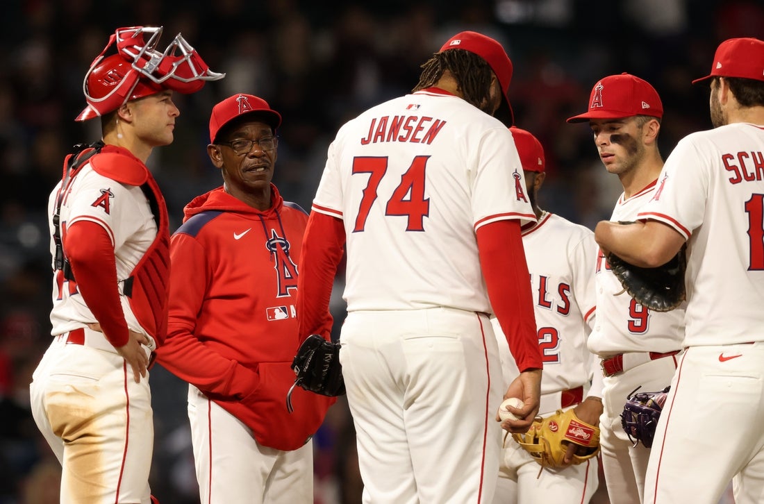 May 2, 2025; Anaheim, California, USA; Los Angeles Angels manager Ron Washington (37) removes Los Angeles Angels pitcher Kenley Jansen (74) from the game during the ninth inning against the Detroit Tigers at Angel Stadium. Mandatory Credit: Jason Parkhurst-Imagn Images