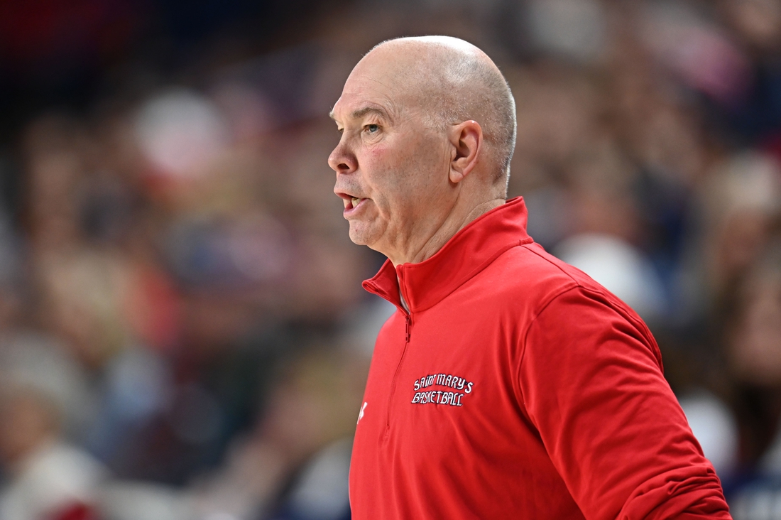 Feb 22, 2025; Spokane, Washington, USA; St. Mary’s Gaels head coach Randy Bennett looks on during a game against the Gonzaga Bulldogs in the first half at McCarthey Athletic Center. Mandatory Credit: James Snook-Imagn Images