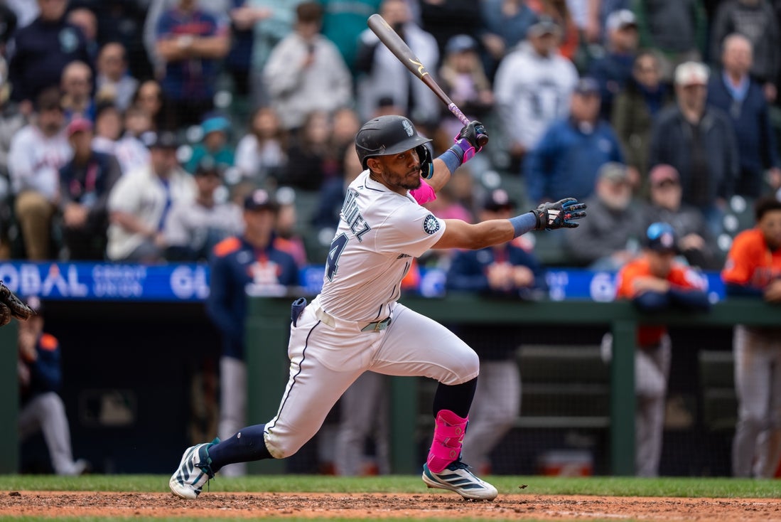Apr 9, 2025; Seattle, Washington, USA; Seattle Mariners centerfielder Julio Rodriguez (44) hits a two-run double during the ninth inning against the Houston Astros at T-Mobile Park. Mandatory Credit: Stephen Brashear-Imagn Images