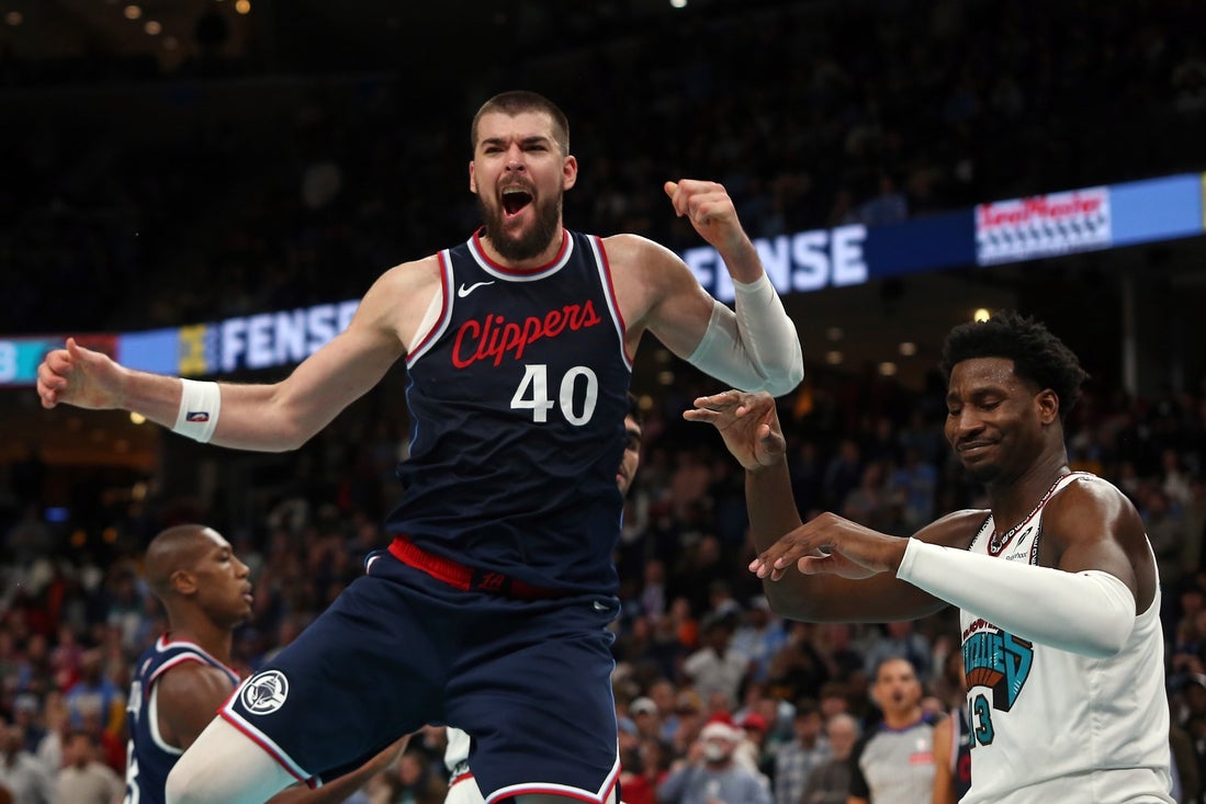 Dec 23, 2024; Memphis, Tennessee, USA; Los Angeles Clippers center Ivica Zubac (40) reacts after a dunk over Memphis Grizzlies forward Jaren Jackson Jr. (13) during the fourth quarter at FedExForum. Mandatory Credit: Petre Thomas-Imagn Images