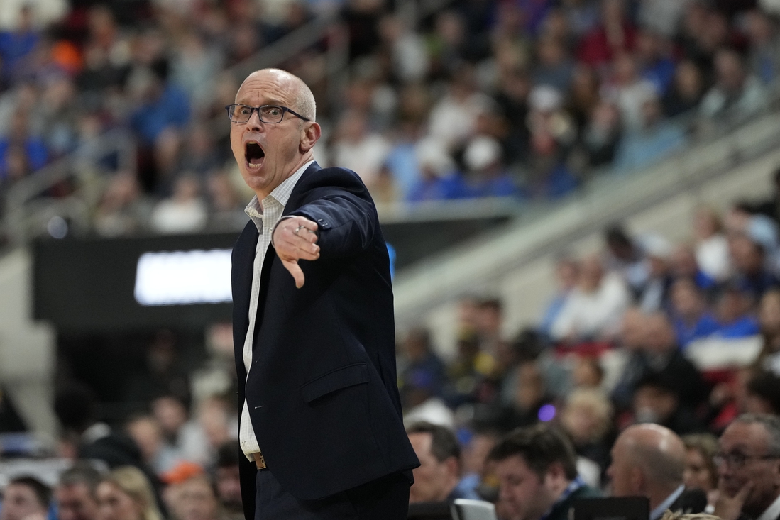 Mar 21, 2025; Raleigh, NC, USA; Connecticut Huskies head coach Dan Hurley reacts during the first half against the Oklahoma Sooners at Lenovo Center. Mandatory Credit: Bob Donnan-Imagn Images