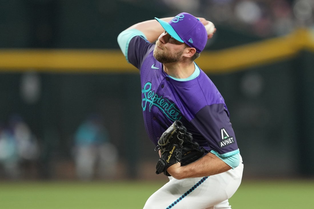 May 10, 2025; Phoenix, Arizona, USA; Arizona Diamondbacks pitcher Corbin Burnes (39) pitches against the Los Angeles Dodgers during the first inning at Chase Field. Mandatory Credit: Joe Camporeale-Imagn Images