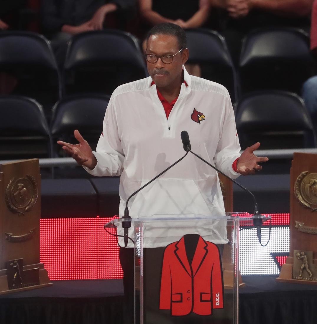 Junior Bridgeman spoke at the Denny Crum Celebration of Life Monday night at KFC Yum Center.May 15, 2023