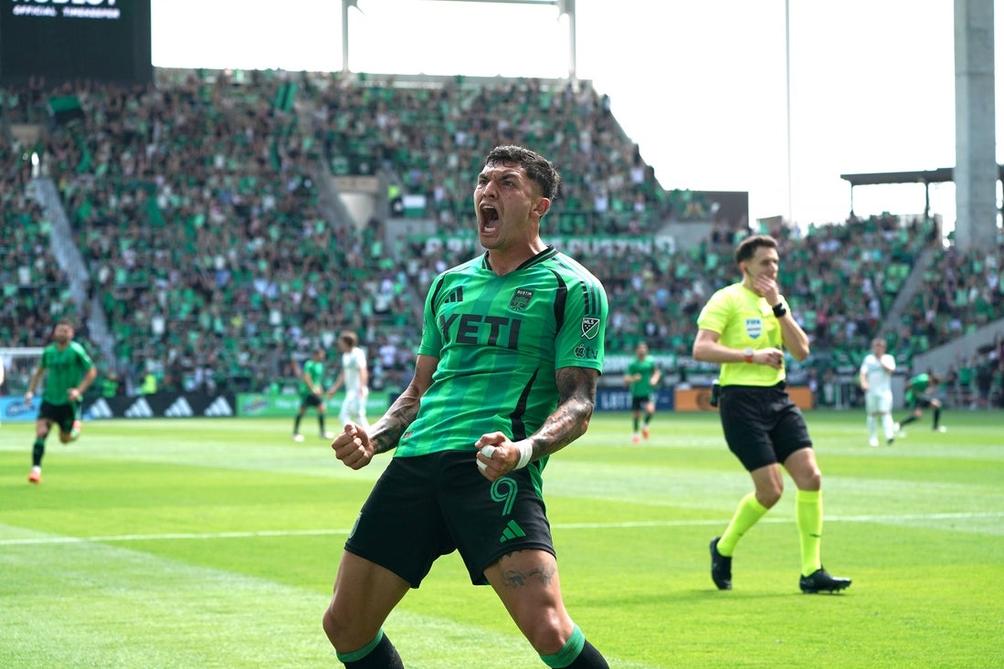 Mar 23, 2025; Austin, Texas, USA; Austin FC forward Brandon Vazquez (9) celebrates after scoring a goal during the first half against San DIego FC at Q2 Stadium. Mandatory Credit: Dustin Safranek-Imagn Images
