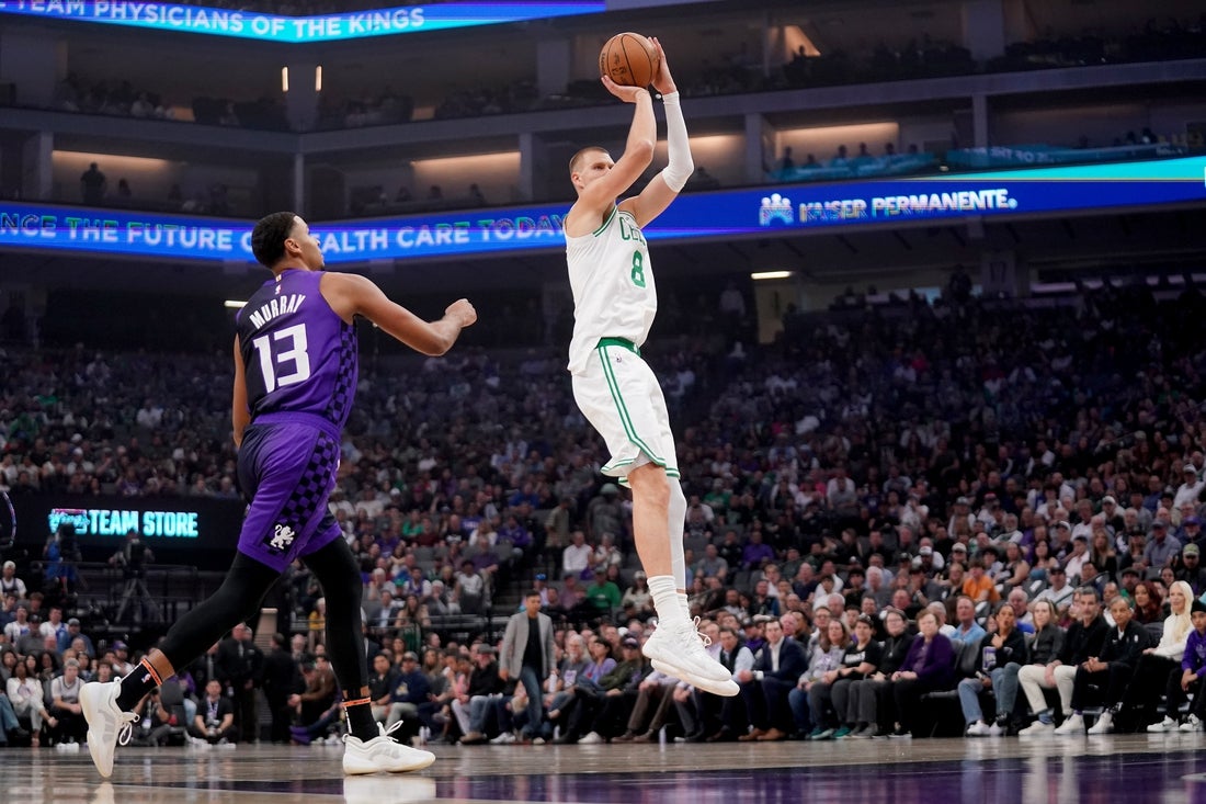 Mar 24, 2025; Sacramento, California, USA; Boston Celtics forward Kristaps Porzingis (8) shoots over Sacramento Kings forward Keegan Murray (13) in the first quarter at the Golden 1 Center. Mandatory Credit: Cary Edmondson-Imagn Images