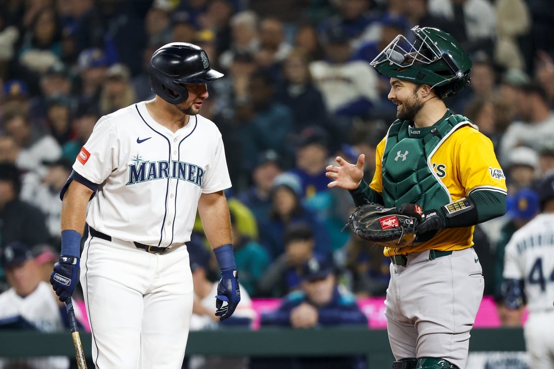 Mar 27, 2025; Seattle, Washington, USA; Athletics catcher Shea Langeliers (23) talks with catcher Cal Raleigh (29) during a first inning at-bat by Raleigh at T-Mobile Park. Mandatory Credit: Joe Nicholson-Imagn Images