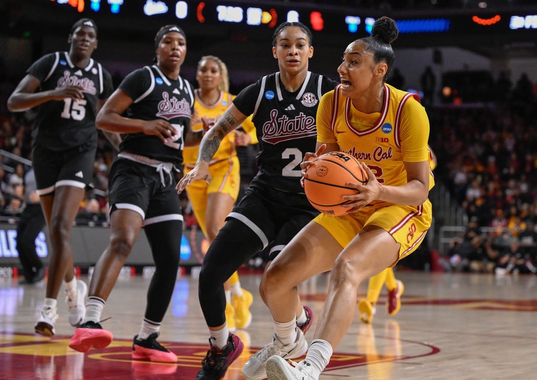 Mar 24, 2025; Los Angeles, California, USA; USC Trojans guard JuJu Watkins (12) drives to the basket past Mississippi State Bulldogs guard Jerkaila Jordan (2) during an NCAA Tournament second round game at Galen Center. Mandatory Credit: Robert Hanashiro-Imagn Images