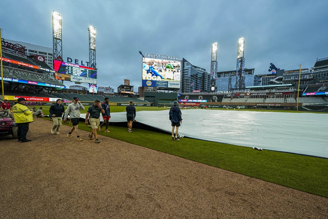 Apr 6, 2025; Cumberland, Georgia, USA; The rain tarp on the field before the game between the Miami Marlins and the Atlanta Braves at Truist Park. Mandatory Credit: Dale Zanine-Imagn Images