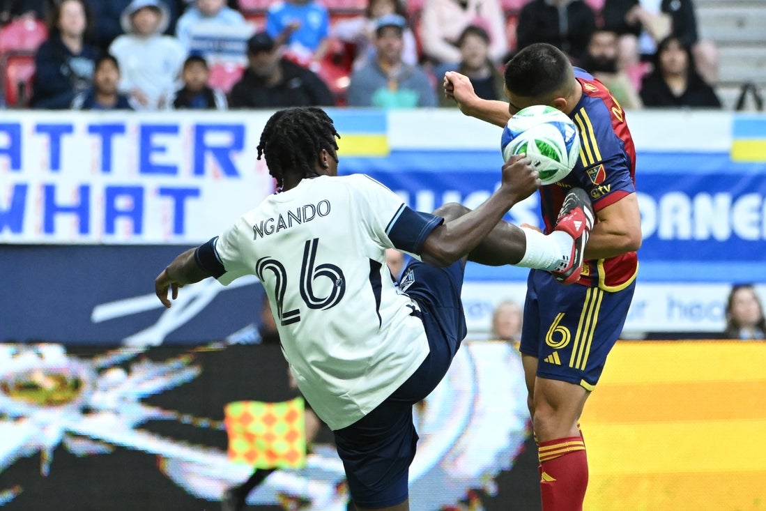 May 3, 2025; Vancouver, British Columbia, CAN; Vancouver Whitecaps FC midfielder Jean-Claude Ngando (26) reaches for the ball against Real Salt Lake midfielder Braian Ojeda (6) during the first half at BC Place. Mandatory Credit: Simon Fearn-Imagn Images