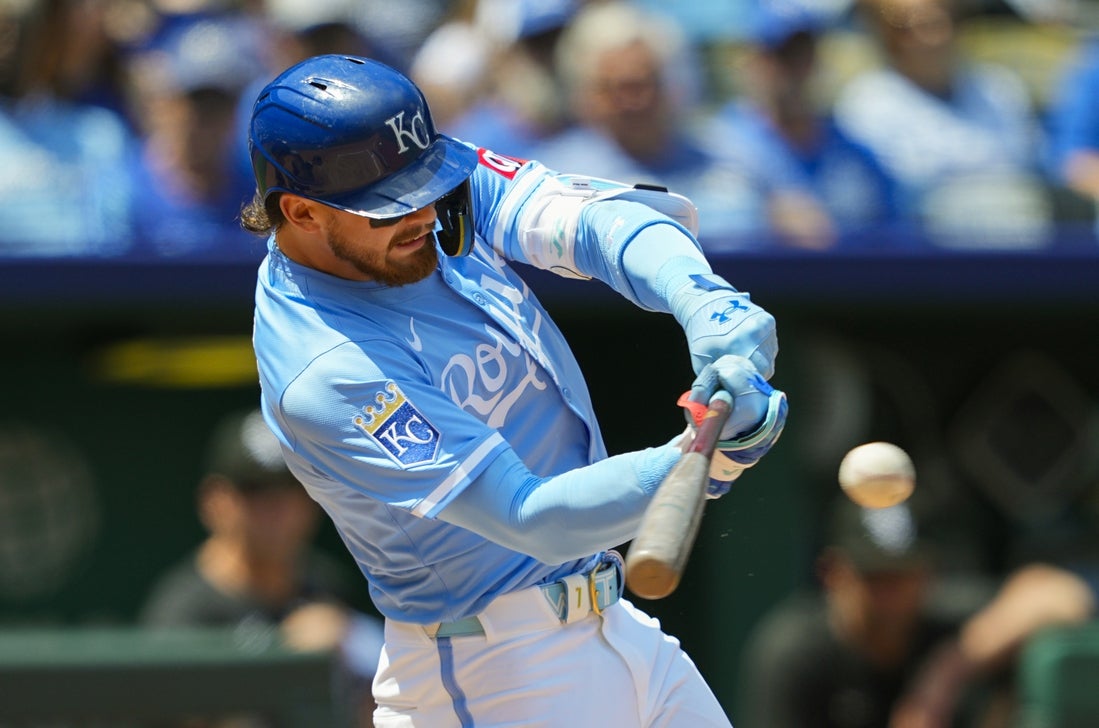 May 8, 2025; Kansas City, Missouri, USA; Kansas City Royals shortstop Bobby Witt Jr. (7) hits a single during the third inning against the Chicago White Sox at Kauffman Stadium. Mandatory Credit: Jay Biggerstaff-Imagn Images