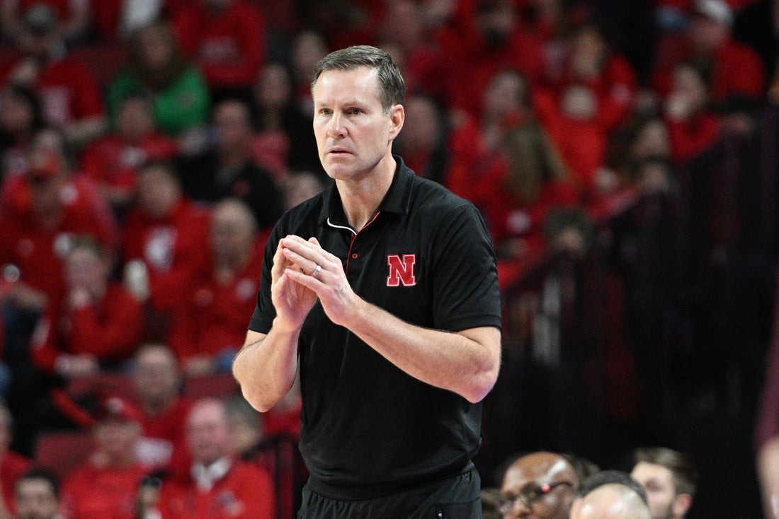 Mar 1, 2025; Lincoln, Nebraska, USA; Nebraska Cornhuskers head coach Fred Hoiberg watches action against the Minnesota Golden Gophers during the second half at Pinnacle Bank Arena. Mandatory Credit: Steven Branscombe-Imagn Images