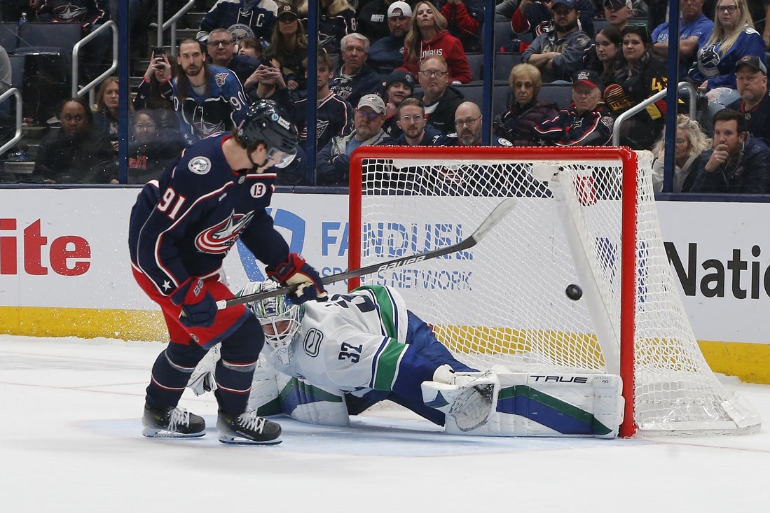Mar 28, 2025; Columbus, Ohio, USA; Columbus Blue Jackets center Kent Johnson (91) scores a goal on Vancouver Canucks goalie Kevin Lankinen (32) during the shootout at Nationwide Arena. Mandatory Credit: Russell LaBounty-Imagn Images