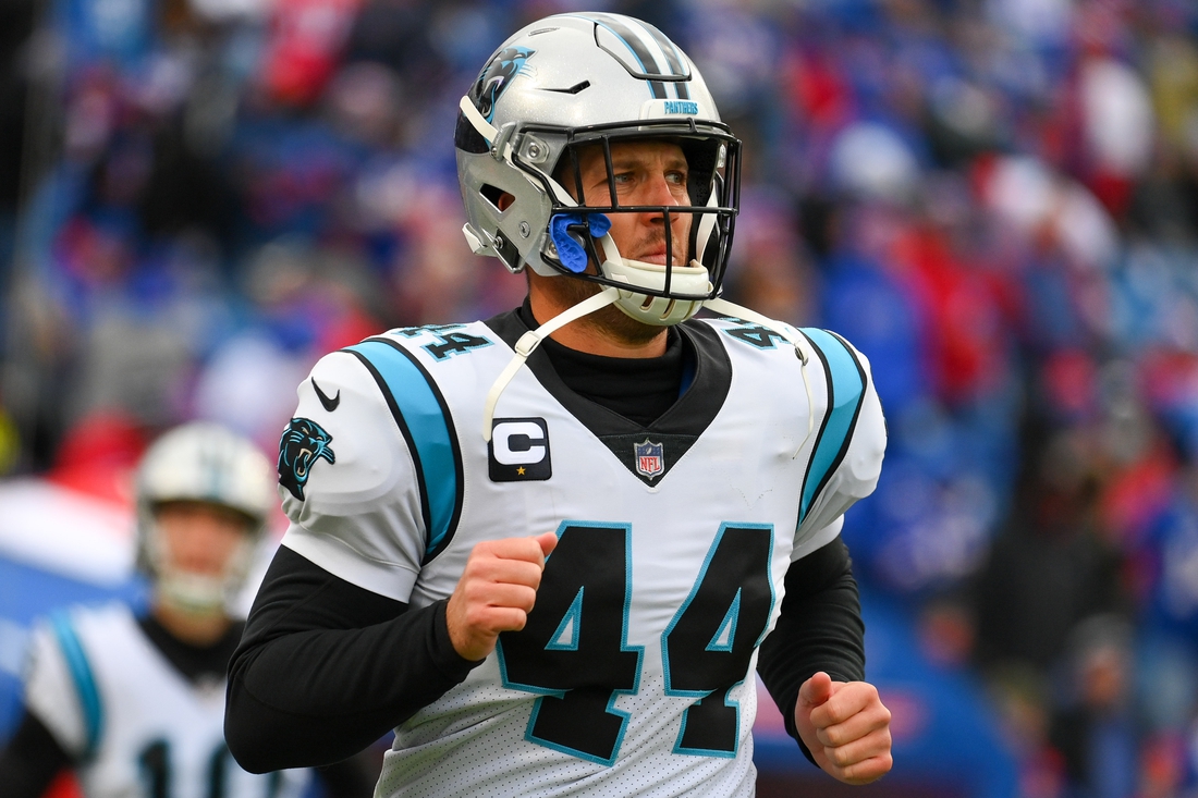 Dec 19, 2021; Orchard Park, New York, USA; Carolina Panthers long snapper J.J. Jansen (44) jogs on the field prior to the game against the Buffalo Bills at Highmark Stadium. Mandatory Credit: Rich Barnes-Imagn Images