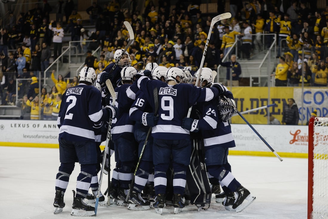 March 8, 2025; Ann Arbor, Michigan, USA; The Penn State Nittany Lions celebrate their win over the Michigan Wolverines at Yost Ice Arena. Mandatory Credit: Brian Bradshaw Sevald-Imagn Images