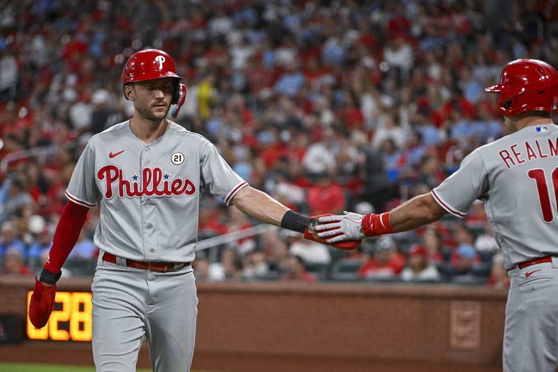 Sep 15, 2023; St. Louis, Missouri, USA; Philadelphia Phillies shortstop Trea Turner (7) is congratulated by catcher J.T. Realmuto (10) after scoring against the St. Louis Cardinals during the first inning at Busch Stadium. Mandatory Credit: Jeff Curry-Imagn Images