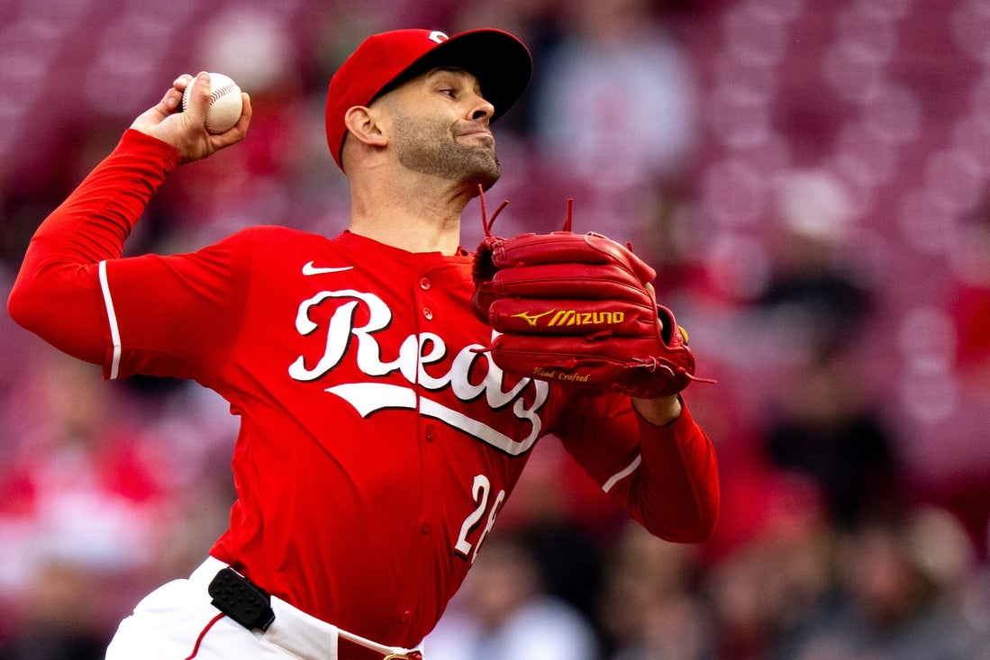 Cincinnati Reds pitcher Nick Martinez (28) pitches in the first inning of the MLB game between Cincinnati Reds and Seattle Mariners at Great American Ball Park in Cincinnati on Wednesday, April 16, 2025.