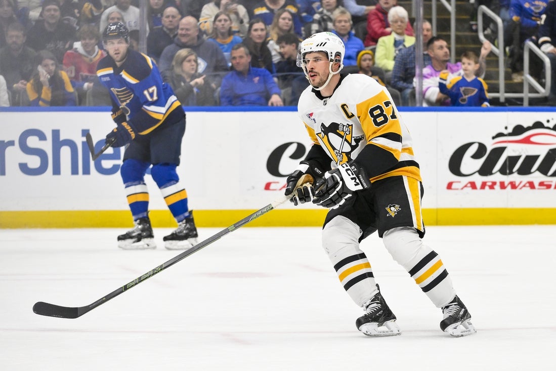Apr 3, 2025; St. Louis, Missouri, USA; Pittsburgh Penguins center Sidney Crosby (87) skates against the St. Louis Blues during the first period at Enterprise Center. Mandatory Credit: Jeff Curry-Imagn Images
