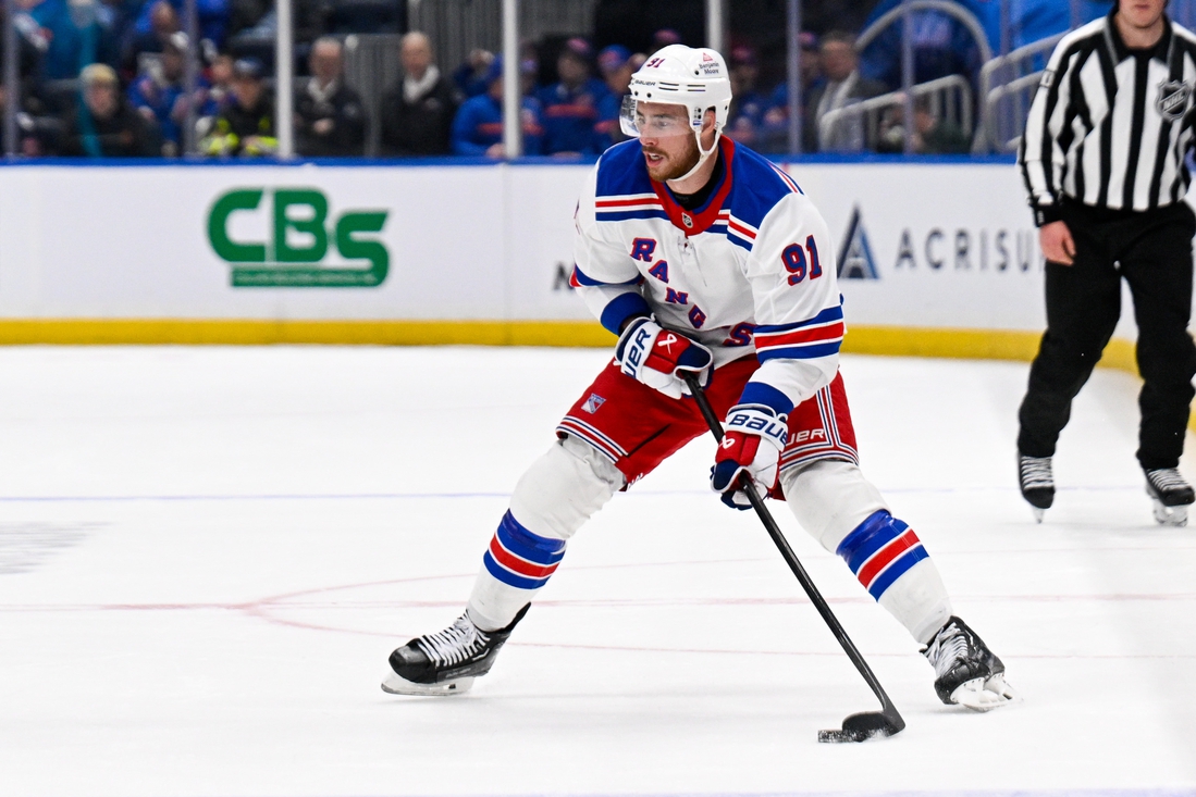 Feb 25, 2025; Elmont, New York, USA; New York Rangers right wing Reilly Smith (91) looks to pass against the New York Islanders during the third period at UBS Arena. Mandatory Credit: Dennis Schneidler-Imagn Images