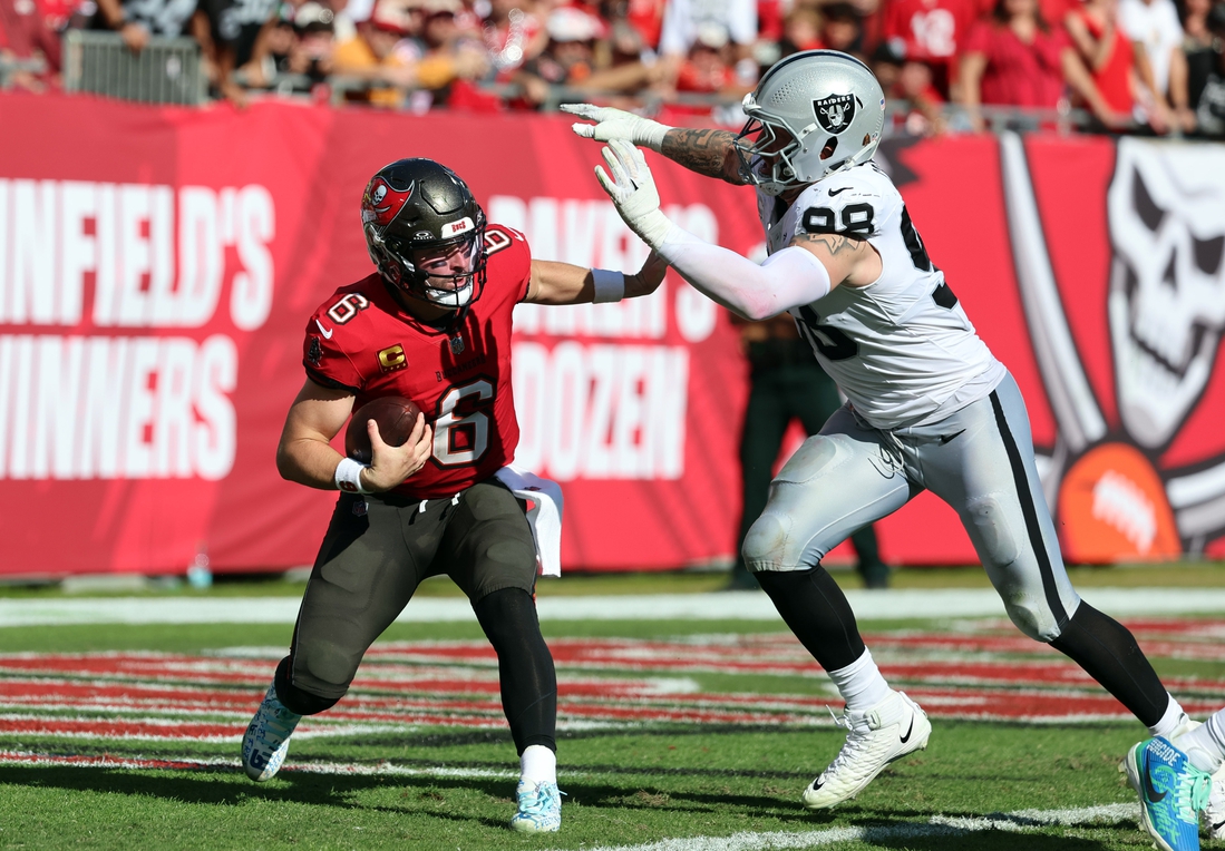 Dec 8, 2024; Tampa, Florida, USA; Tampa Bay Buccaneers quarterback Baker Mayfield (6) gets pressured by Las Vegas Raiders defensive end Maxx Crosby (98) during the second quarter at Raymond James Stadium. Mandatory Credit: Kim Klement Neitzel-Imagn Images
