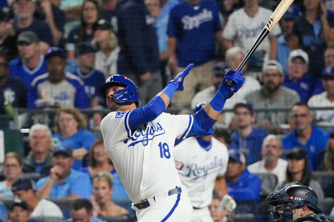 Oct 10, 2024; Kansas City, Missouri, USA; Kansas City Royals first baseman Yuli Gurriel (18) at bat against the New York Yankees during game four of the NLDS for the 2024 MLB Playoffs at Kauffman Stadium. Mandatory Credit: Denny Medley-Imagn Images