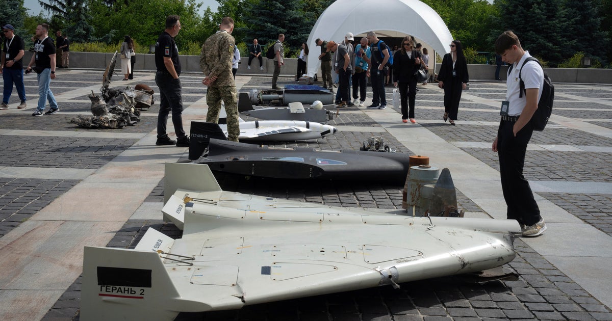 Visitors check damaged Russian drones during the International Conference on Expanding Sanctions Against Russia in Kyiv, Ukraine, Friday, June 27, 2025.