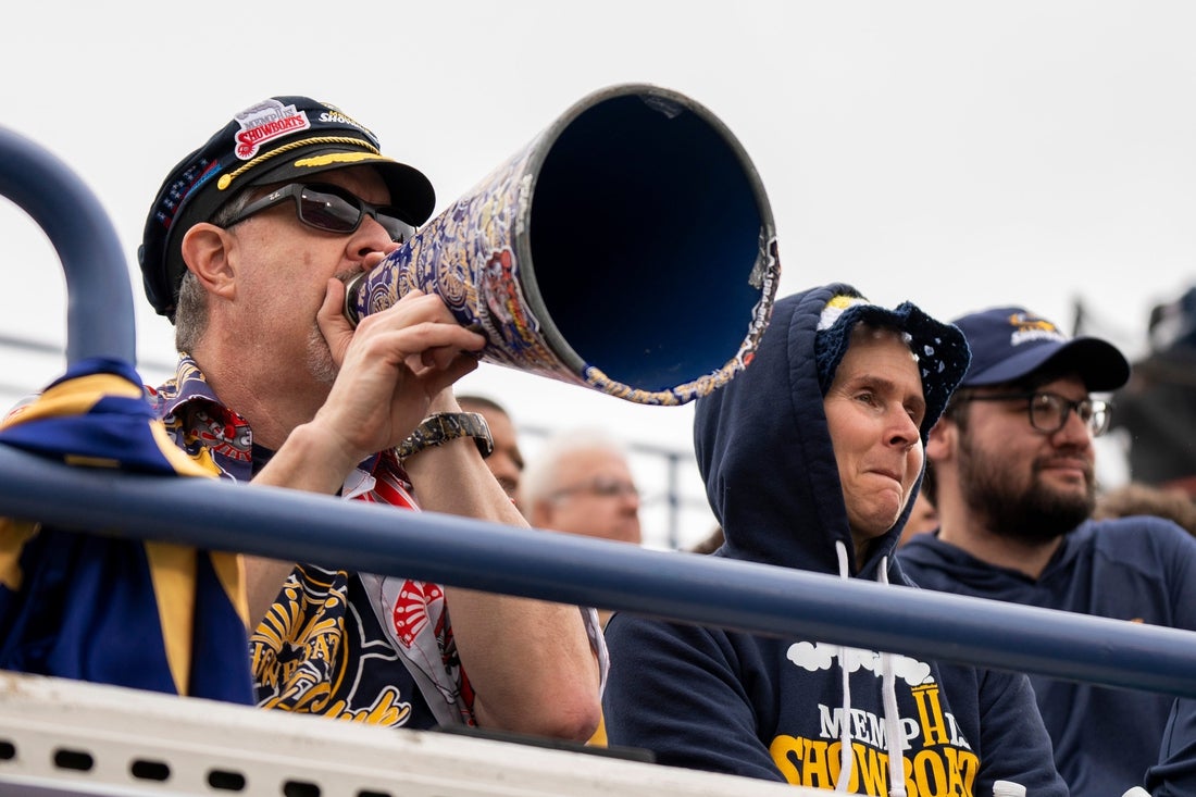 Showboats fans cheer on their team during the UFL game between the Memphis Showboats and Michigan Panthers at Simmons Bank Liberty Stadium in Memphis, Tenn., on Sunday, March 30, 2025.
