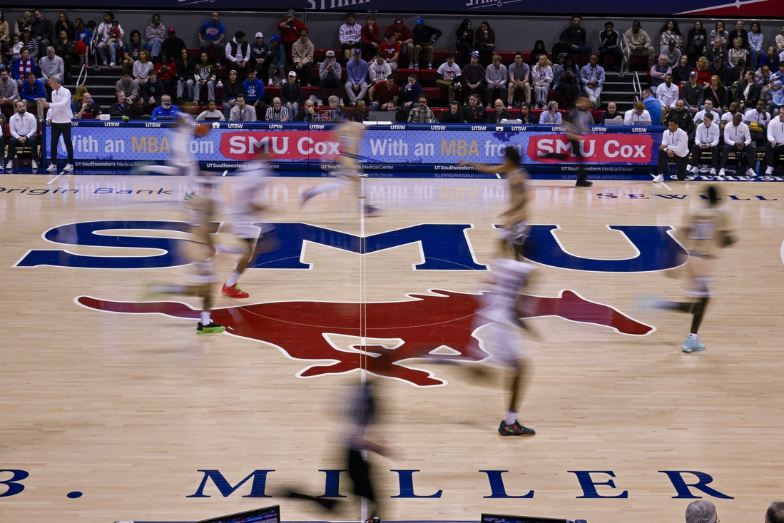Jan 11, 2025; Dallas, Texas, USA; (editor’s note, in camera motion blur) A view of the SMU Mustangs logo during the first half of the game between the SMU Mustangs and the Georgia Tech Yellow Jackets at Moody Coliseum. Mandatory Credit: Jerome Miron-Imagn Images
