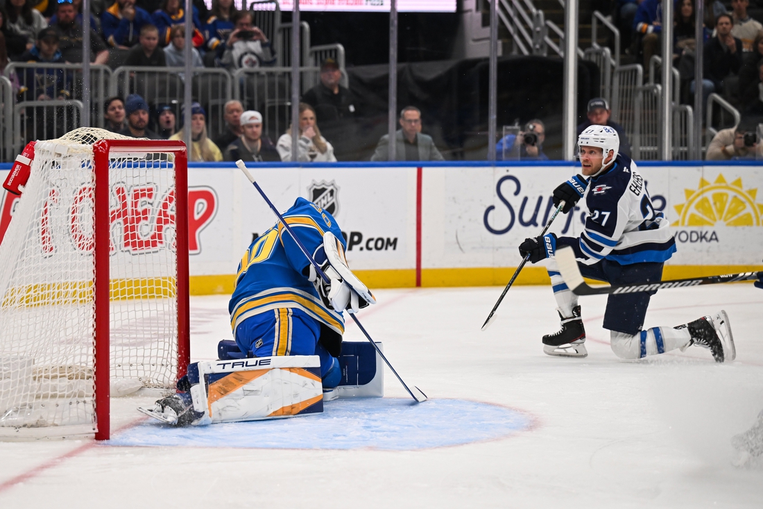 Feb 22, 2025; St. Louis, Missouri, USA; Winnipeg Jets left wing Nikolaj Ehlers (27) scores a goal against the St. Louis Blues during the first period at Enterprise Center. Mandatory Credit: Connor Hamilton-Imagn Images