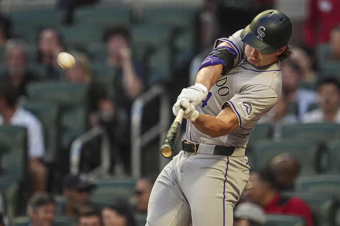 Sep 5, 2024; Cumberland, Georgia, USA; Colorado Rockies center fielder Brenton Doyle (9) hits a home run against the Atlanta Braves during the second inning at Truist Park. Mandatory Credit: Dale Zanine-Imagn Images