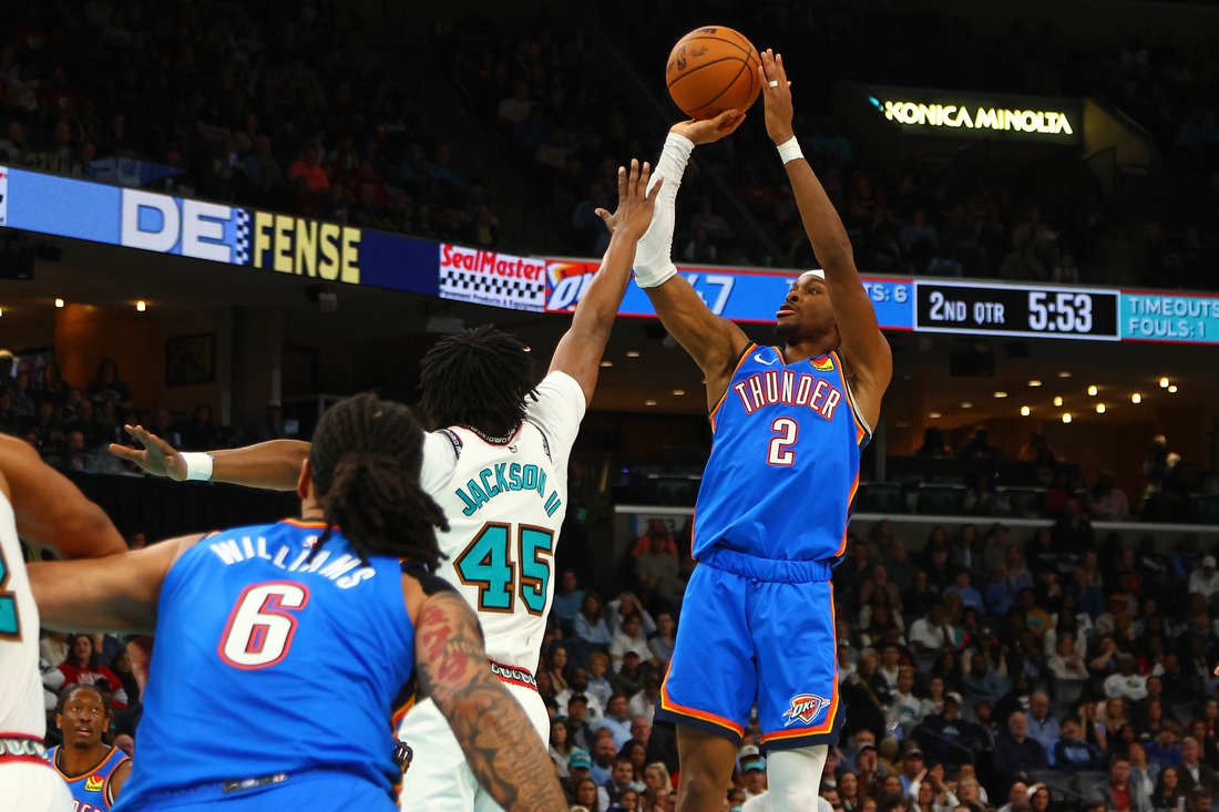 Feb 8, 2025; Memphis, Tennessee, USA; Oklahoma City Thunder guard Shai Gilgeous-Alexander (2) shoots as Memphis Grizzlies forward GG Jackson II (45) defends during the second quarter at FedExForum. Mandatory Credit: Petre Thomas-Imagn Images
