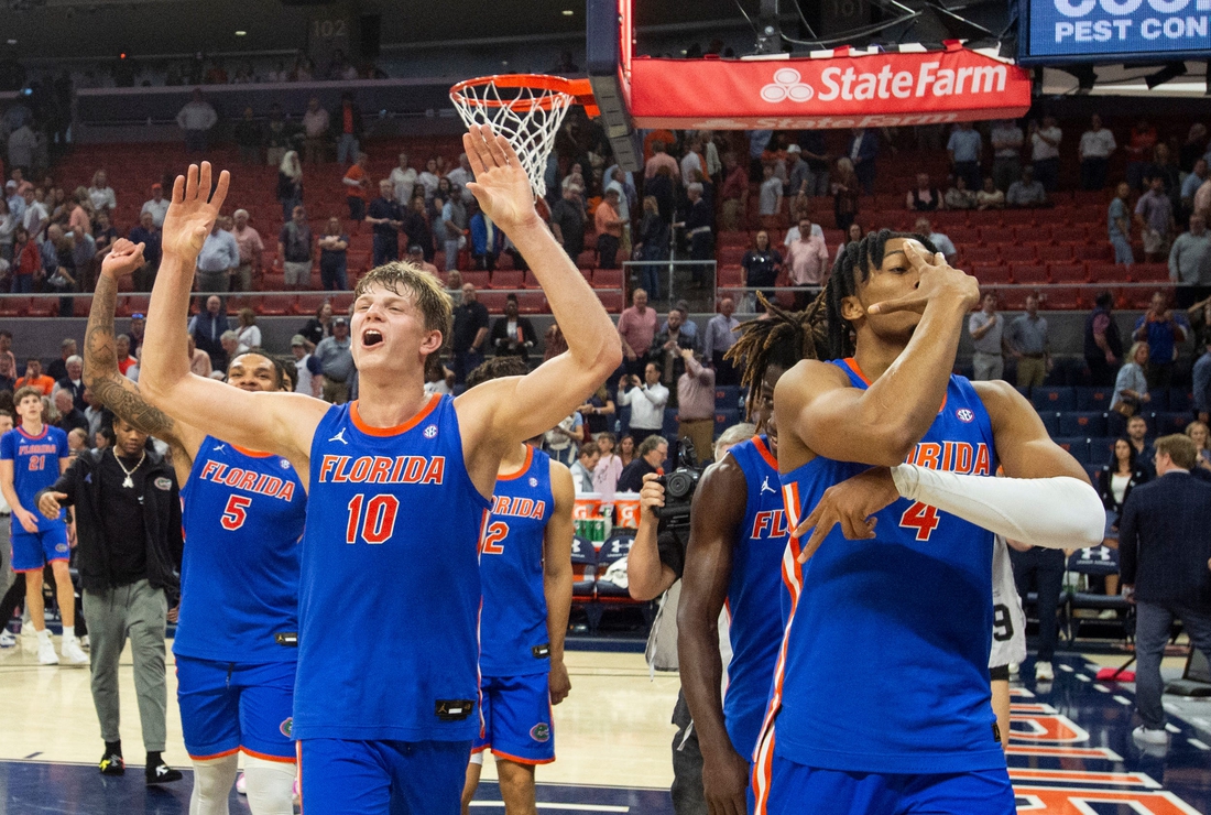 Florida Gators players acknowledge fans as they walk off the court as Auburn Tigers take on Florida Gators at Neville Arena in Auburn, Ala., on Saturday, Feb. 8, 2025. Florida Gators defeated Auburn Tigers 90-81.