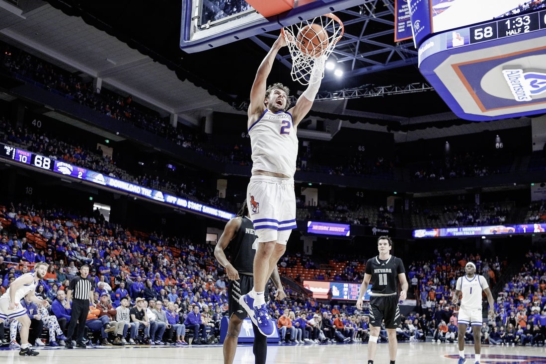 Mar 5, 2024; Boise, Idaho, USA; Boise State Broncos forward Tyson Degenhart (2) dunks during the second half against the Nevada Wolf Pack at ExtraMile Arena. Nevada beats Boise Statwe 76-66. Mandatory Credit: Brian Losness-Imagn Images