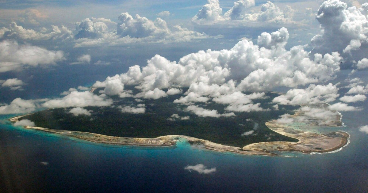 Satellite photographs show a coral reef-fringed island — stretching to some six miles at its widest point — with thick forest and white sand beaches.