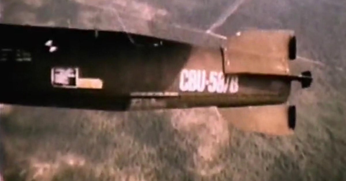 A CBU-58/B cluster bomb, manufactured by the Honeywell Corporation in Minneapolis, is seen being dropped on Laos from a U.S. B-52 bomber during the Vietnam war.