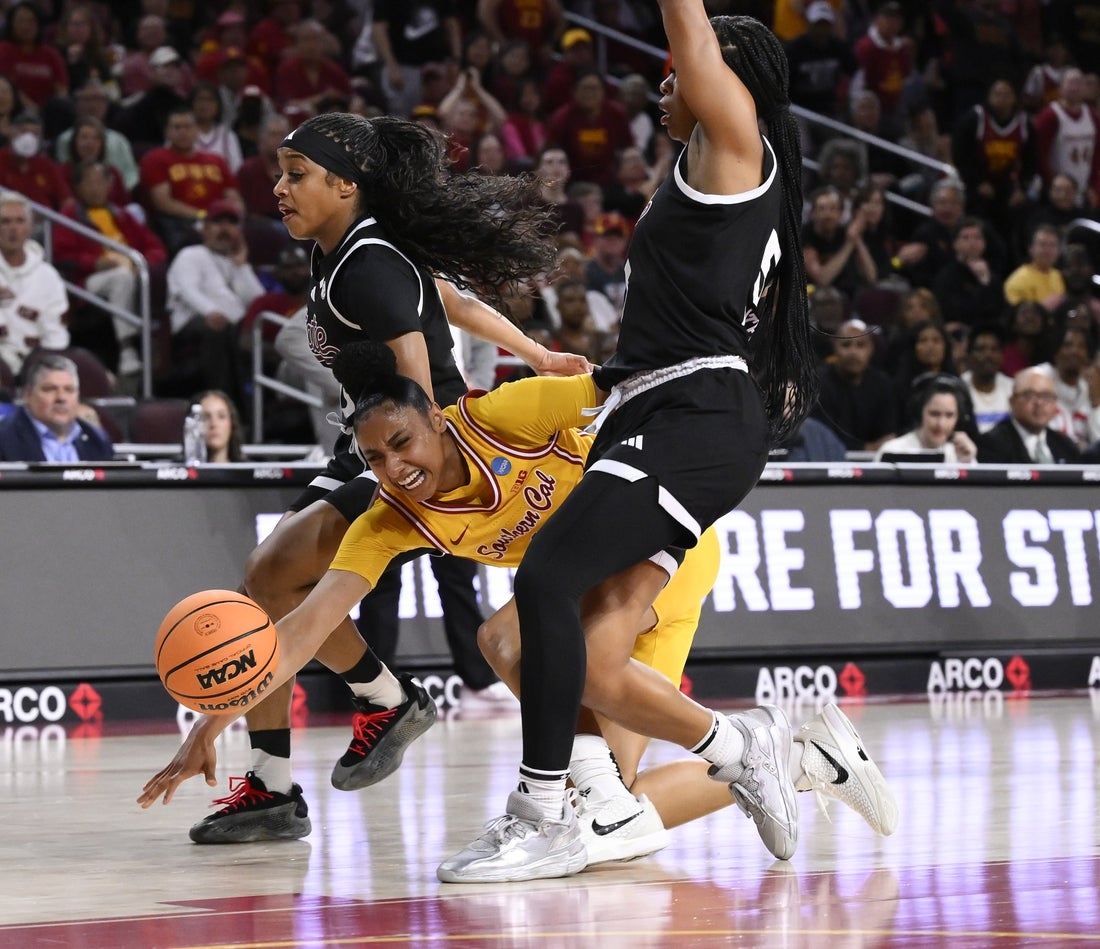 Southern California standout forward JuJu Watkins left the No. 1-seeded Trojans’ second-round matchup with Mississippi State in Los Angeles on Monday midway through the first quarter after falling to the floor on a breakaway.