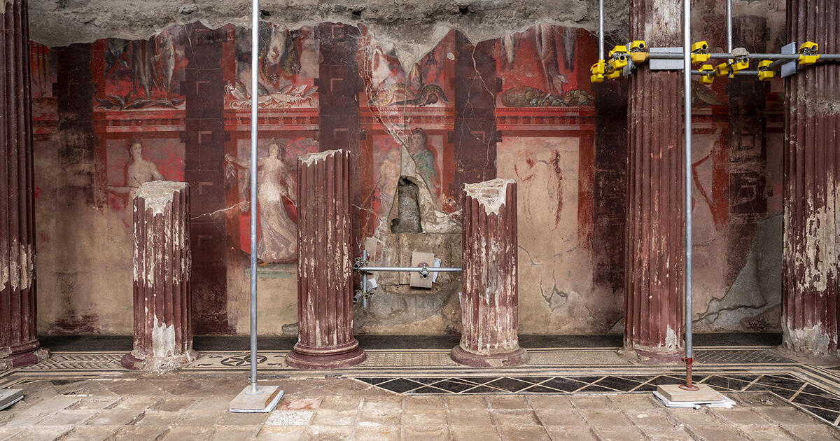 “Young satyrs with pointed ears play the double flute, while another performs a sacrifice of wine in acrobatic style, squirting wine behind him from a drinking horn into a patera (shallow bowl),” Pompeii said in a statement, while releasing several images of the discoveries.