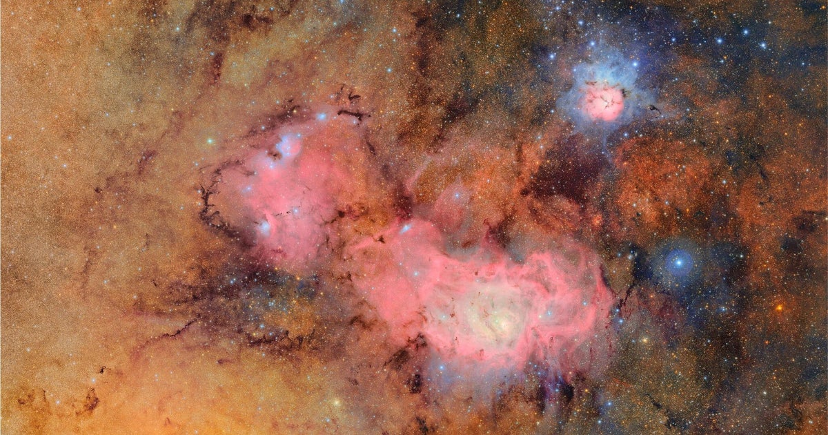 One of them is a composite of 678 exposures taken over just seven hours, capturing the Trifid Nebula and the Lagoon Nebula — both several thousand light-years from Earth — glowing in vivid pinks against orange-red backdrops.